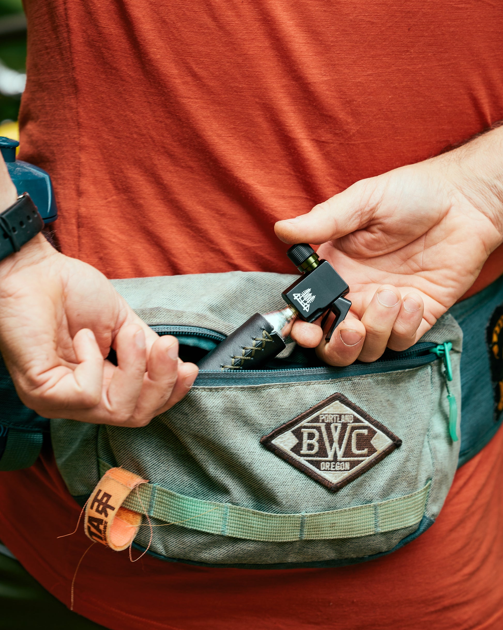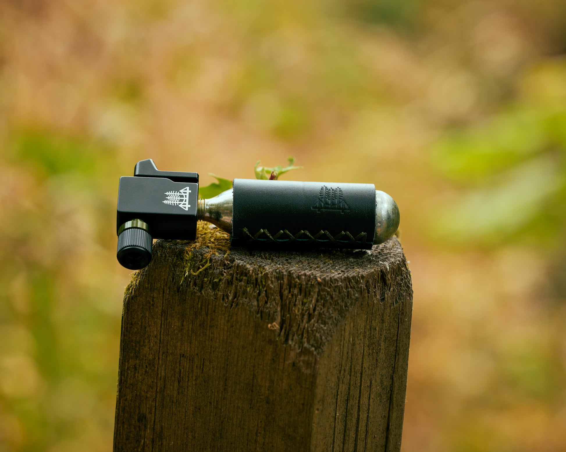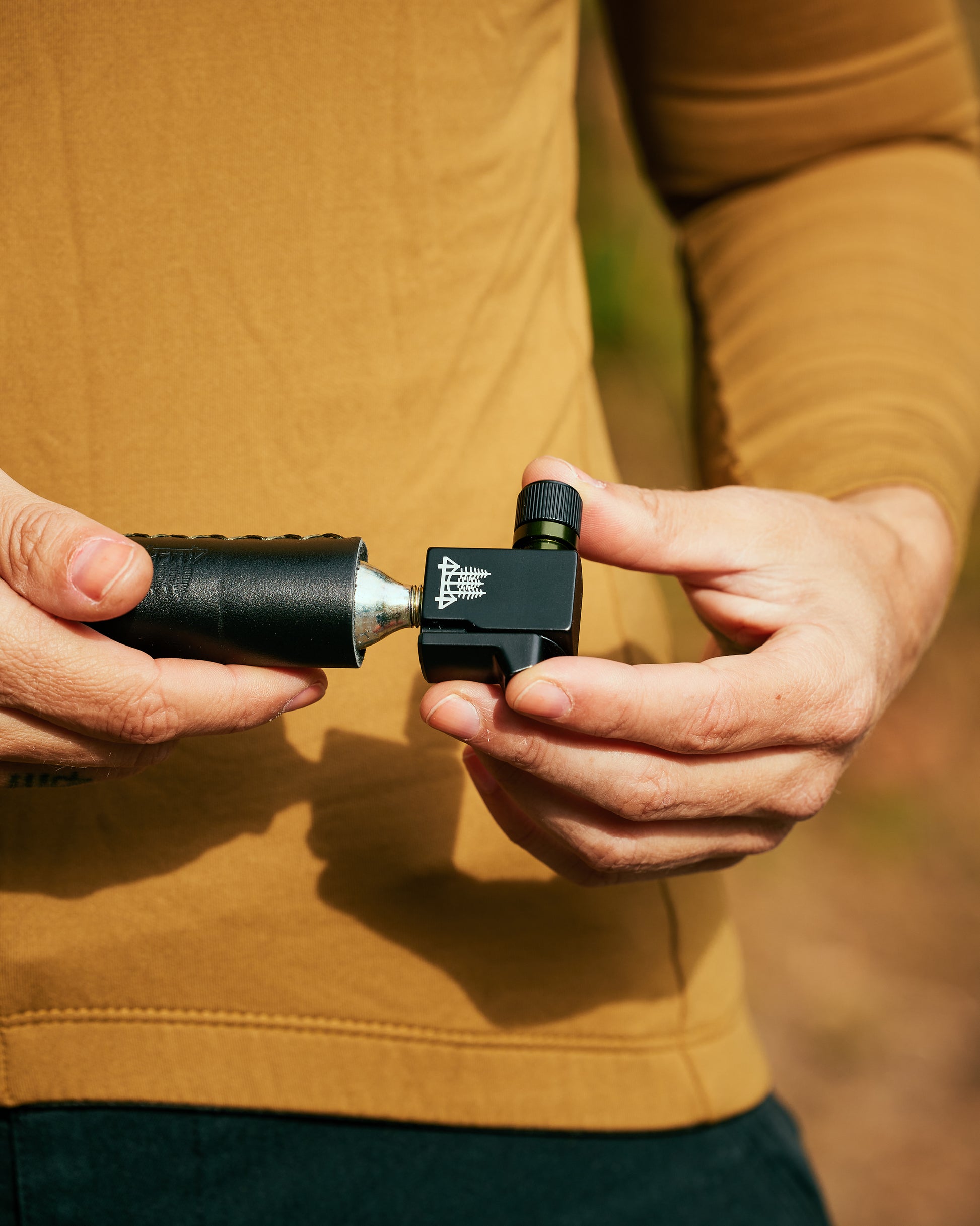 クラウドキャップ CO2インフレーターはコンパクトで、全てが金属製のCO2インフレーターです。レバーによりCO2の流入量を繊細にコントロールできる革新的な機構を持ち、レバーを使わない時はコンパクトに本体にロックされる、ロープロファイルなデザインです。小さな保護バッグとレザー製のCO2カートリッジ用スリーブが付属します。