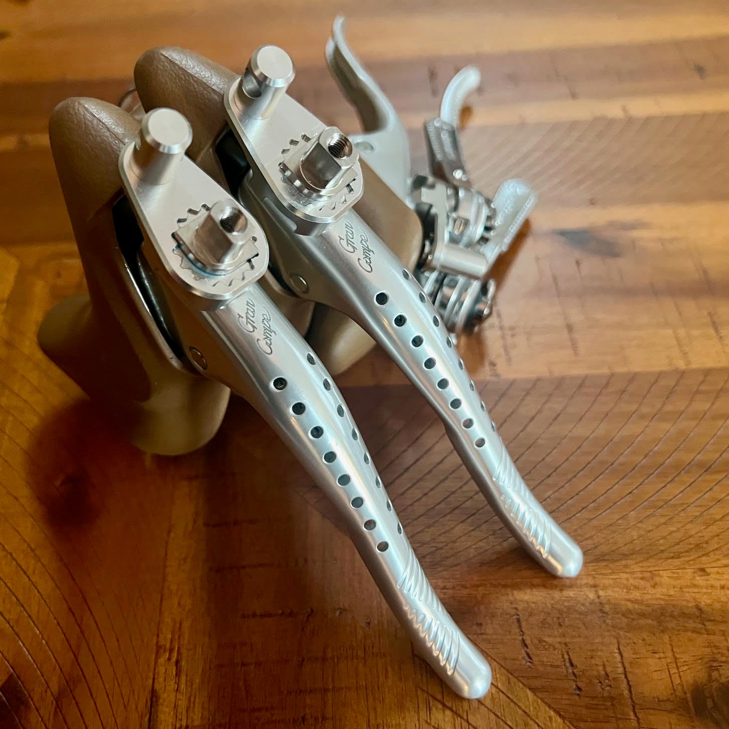 対応するシフターですが、カンパニョーロのレバーのみケーブルの溝がケーブルハンガーの位置と少しずれているため、シフトレバーとマウントの間に2mmのスペーサーを追加し、より長いボルトを取り付けする必要があります。