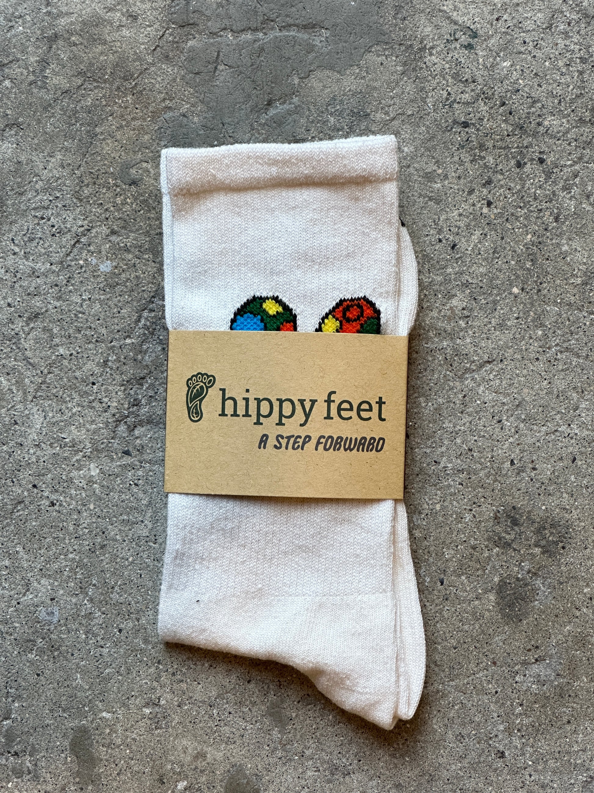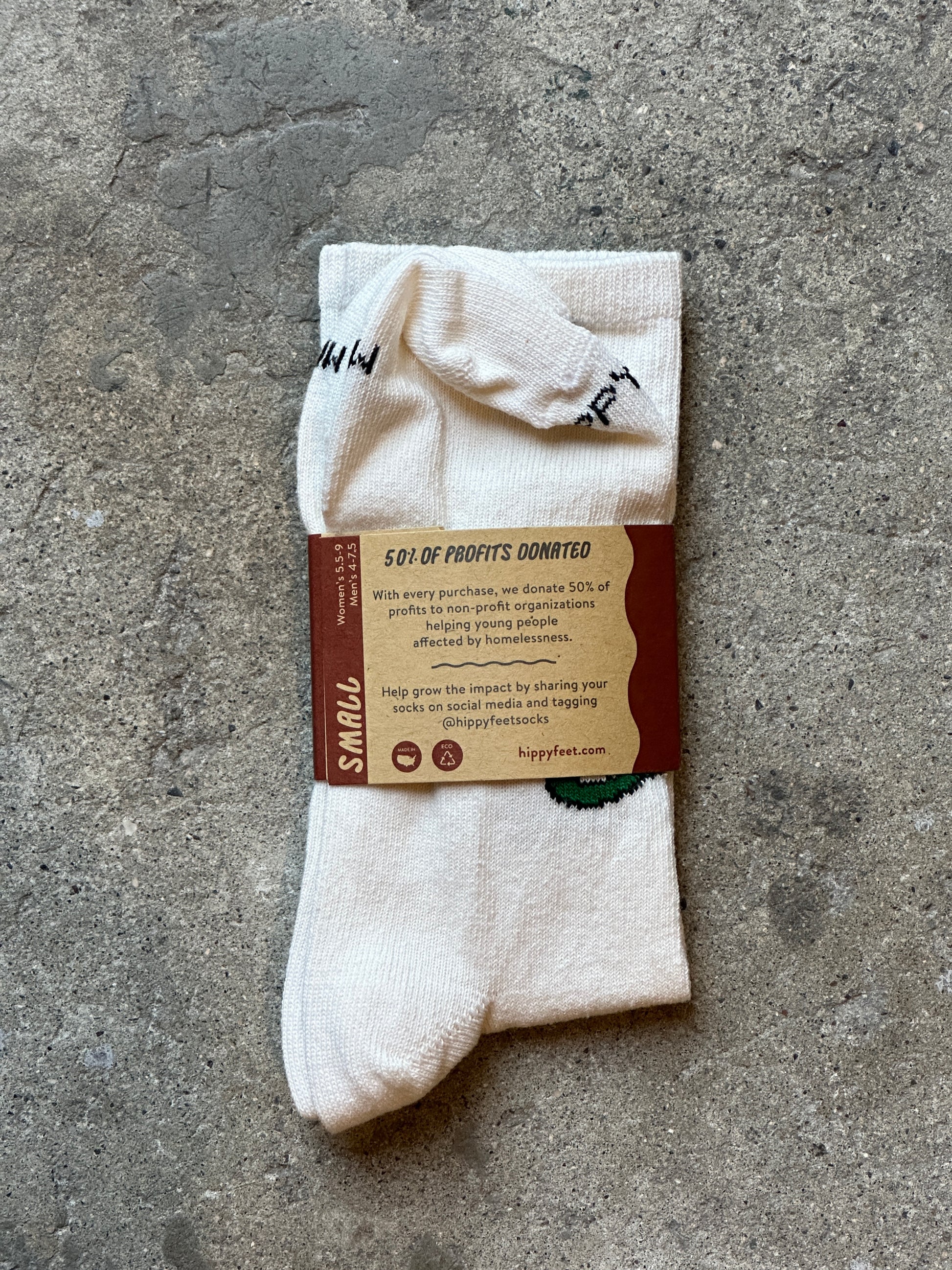 アイダホ州ボイジの女性アーティスト、アシュレイ・ドレイファスのアートワークをクルーなソックスに落とし込みました。ミネアポリスを拠点とするHippy Feet社が製造し、購入ごとに地元コミュニティに還元されます。